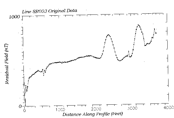 Figure 1 shows a ground magnetic profile collected on the flank of a magnetic anomaly from a diabase intrusive. The anomaly of interest lies between 500 feet and 2500 feet on the profile. It is obscured mildly by 4 short-wavelength, high amplitude anomalies from cultural objects. There are several approaches to removing this noise. First, examine the spectrum of the data.