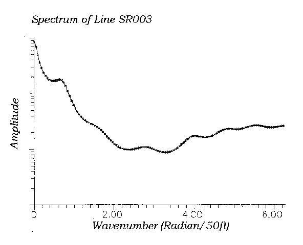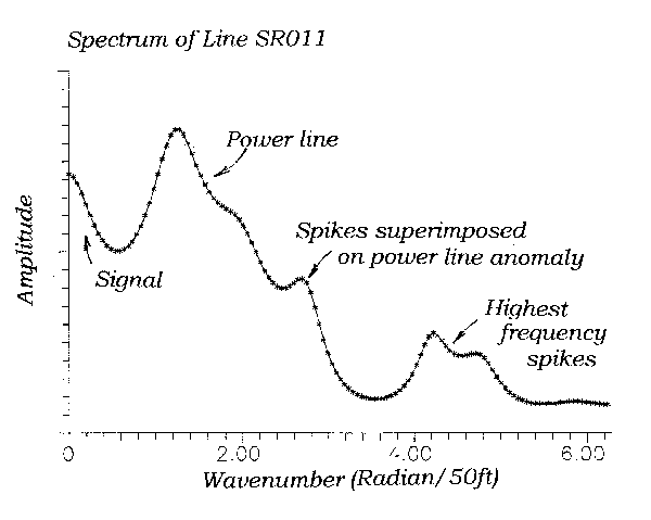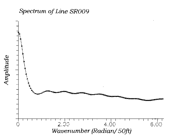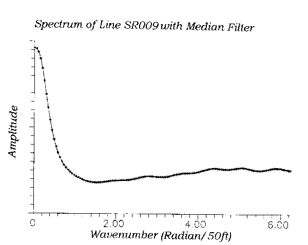 The effect of a de-spiking running median, on the other hand, is difficult to characterize. Its behavior depends on the data. In some respects it behaves like a low-pass filter. I demonstrated this behavior in my example. However, it is possible to get a short-wavelength but persistent sinusoid to pass through a running median, and sharp signal transitions, clock pulses for instance, can pass through it unaltered. Thus, the running median is not really a low-pass filter. Also, a running median filter may actually increase the high-wavenumber noise while it eliminates spikes. Figure 4 for example shows the spectrum of line #9 computed after application of the running median filter. As shown, the high-wavenumber noise level has increased even as noise in the range of 1.0-3.0 rad/50ft. has decreased.