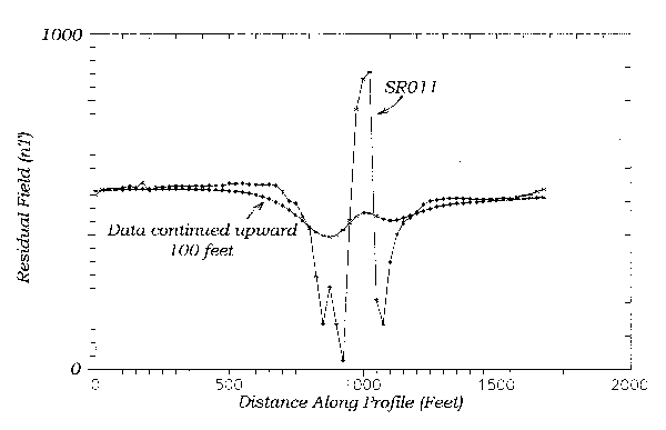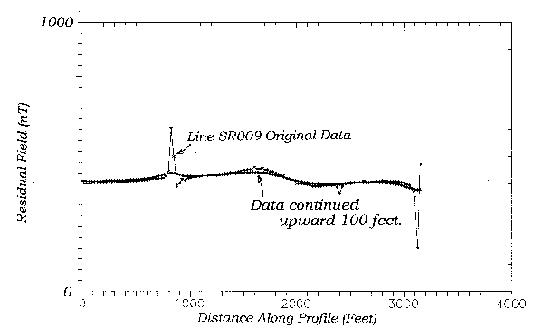 One low pass filter that provides smoothing but which does not distort models made from the smoothed data is analytic continuation away from the source. I will refer to this as upward continuation, as is the custom in geophysics. But because sources may be simultaneously above and below our profile, it is more accurately called continuation away from the source. Analytic continuation away from a source is a low-pass filter. It is purely a calculation of what the field would look like at a greater distance from the source. It does not distort the shape of any model fitting the data, but it does reduce resolution by virtue of placing our observations further away.
