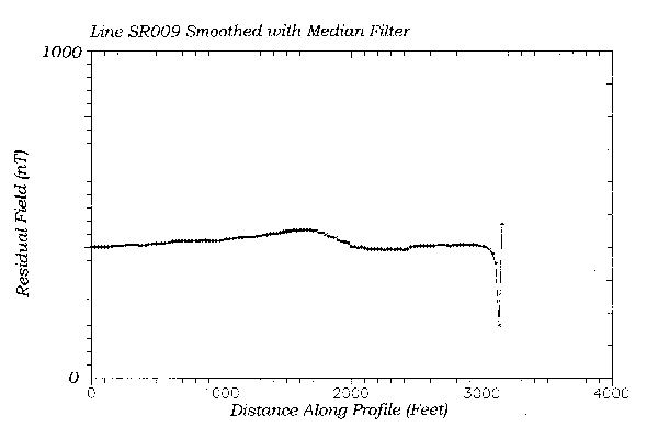 A particularly useful de-spiking filter is the running median filter. Several efficient algorithms for computing a running median are available in the literature (Evans, 1982). Figure 3 shows the result of passing our magnetic profile through an 11 point running median filter. The noise spikes are removed completely, without altering the shape of the anomaly of interest. This is an important consideration. If our filtering operation distorts the shape of an anomaly, it obviously affects any interpretation we make through modeling.