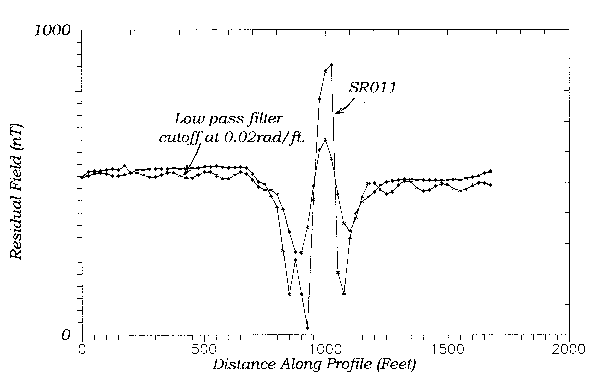 One question we would like to answer is how are we distorting our signal in the process of smoothing. The running average filter is easy to analyze in this regard. It, and any similar low pass filter, tends to increase the apparent depth of the source. Thus, models constructed from data smoothed with a low-pass filter will tend to be too deep. Moreover, most low-pass smoothing tends to move shallow sources much further than deep sources. Thus, if the data contain useful information on the vertical distribution of sources or the shape of a source, that information is distorted or lost completely with smoothing.