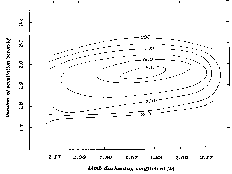 Note that contours are elliptical in a slightly oblique direction. This shows that k and diameter are correlated, but only slightly so. Therefore, a person should be able to find values for k and duration independently of one another. By choosing to call the point at the minimum residual my best fit, I found that a diameter of Titan of 5686 (114km and the limb darkening coefficient of 1.75 (.15. This is a substantially smaller diameter for Titan than Elliot found, and lies below his estimated uncertainty interval. My estimate of the mid-time of the occultation is 0.07seconds later than Elliot's, which is to say about 3.5% later when compared to the 1.94 second duration of the event.