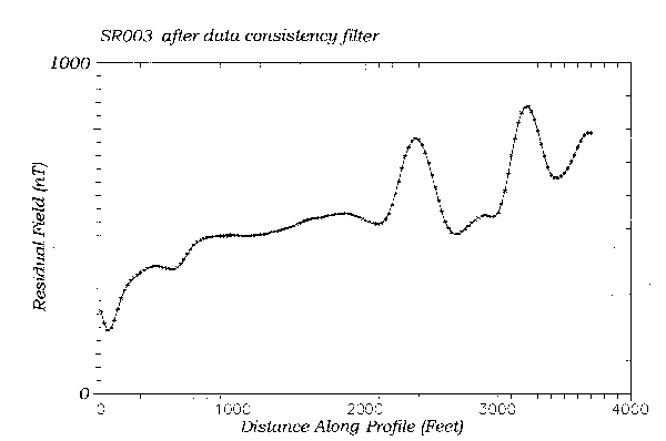 A particularly useful de-spiking filter is the running median filter. Several efficient algorithms for computing a running median are available in the literature (Evans, 1982). Figure 3 shows the result of passing our magnetic profile through an 11 point running median filter. The noise spikes are removed completely, without altering the shape of the anomaly of interest. This is an important consideration. If our filtering operation distorts the shape of an anomaly, it obviously affects any interpretation we make through modeling.
