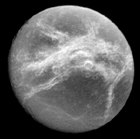 The smaller satellites are another story. They have no atmospheres to complicate the issue of their diameters, but they are very complex bodies. They have highly cratered surfaces that vary in brightness. Some of the brightness variation results from eruptive products being distributed unevenly on the surface. Additional brightness variation results from the way the satellites orbit Saturn. Some of these satellites present the same face to Saturn as they orbit. The side constantly facing into the orbit picks up debris, which gives it different optical properties than the trailing face. Iapetus is so extreme in this regard that the albedo of the forward face is about one-tenth that of the trailing face. Cassini claimed that he could see Iapetus only when it was to one side of Saturn 7,8.