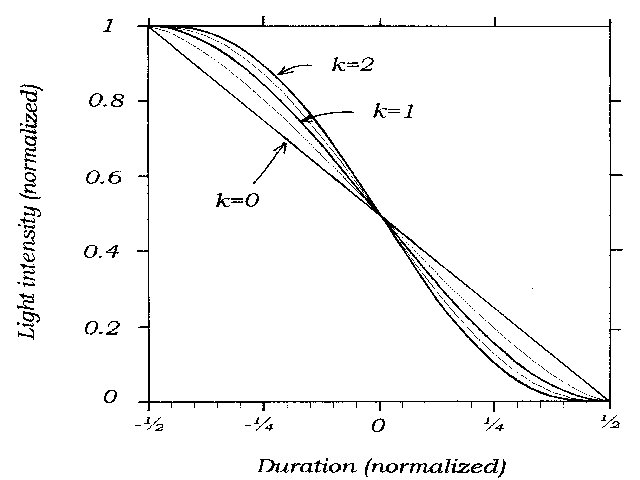 Figure 3 shows ideal light curves for varying values of k. An inspection of these curves show that the light curve has more shape at its extremes, which makes the extremes more sensitive to the value of k. Note, too, that in the central half of the light curve there is almost no difference between increasing k and shortening the duration. This explains the anti-correlation of these two parameters that plagued Elliot.