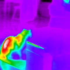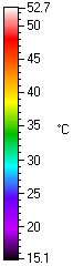 There are two IR images on this page which show why the distinction between radiosity and emissive power is so important for evaluating infrared data. Figure 1 shows my cat, Oliver Heaviside, with his back to the fireplace. We all know how cats love warmth, but if you refer to the temperature scale for the colors in this image, poor Oliver is 53°C at the warmest part of his back. This is very hot. How can Oliver withstand such temperatures?